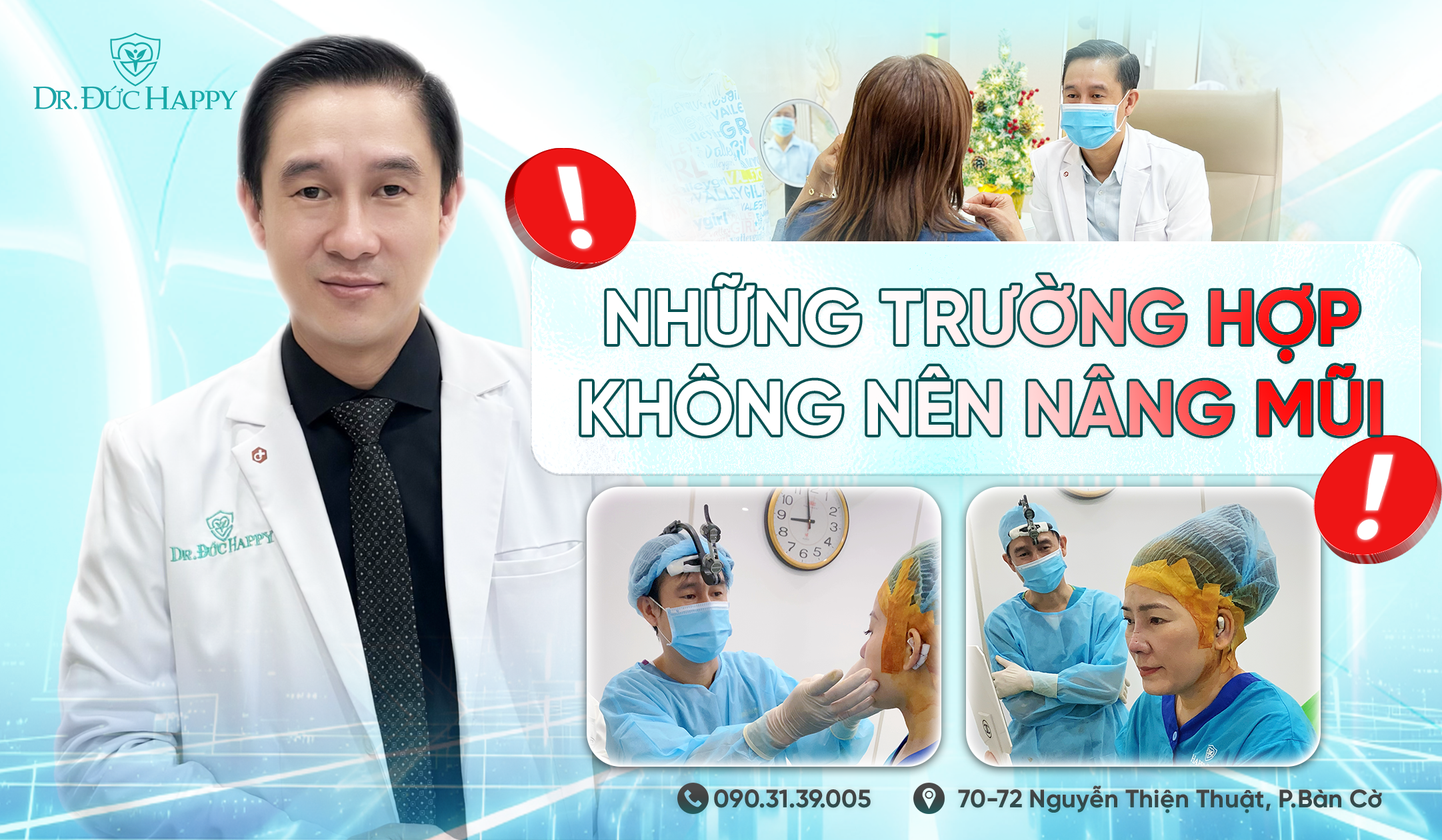 Bác sĩ Đức Happy (Dr. Đức Happy) có hơn 15 năm kinh nghiệm trong lĩnh vực phẫu thuật thẩm mỹ mũi. Tất cả ca phẫu thuật đều được thực hiện trực tiếp, không giao cho bác sĩ khác và mỗi khách hàng đều được lên phác đồ cá nhân hóa dựa trên cấu trúc mũi riêng.